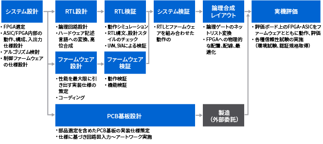 FPGA開発を中心に、ファームウェアおよび基板開発にも対応。要件定義から設計・検証・実装・評価・製造まで、部分的な支援/開発工程全体をお任せください。